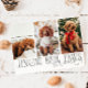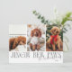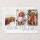 Minimal and modern holiday photo template card featuring 3 photos of your pup on the front with a text that says "Jingle Bell Paws" with your family signature. You can also add another picture and message on the back. The background is white.