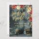 A classy and elegant holiday invite in classic black background with holiday red floral bouquets and evergreen greenery with shimmering gold calligraphy and a sprinkle of delicate snowflakes, inviting your guests to your holiday celebration. The back of the card doubles as a Happy Holidays card.