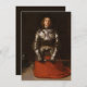 This design features a painting by the English artist Sir John Everett Millais, who was one of the founders of the Pre-Raphaelite Brotherhood. It is a powerful and introspective portrayal of the French heroine, capturing her in a moment of profound spiritual connection. Painted in 1865, this work exemplifies Millais' Pre-Raphaelite dedication to detail, historical accuracy and emotional depth. Joan of Arc is depicted kneeling indoors in a wood-panelled room; she is dressed in a full suit of armour. The setting is simple, focusing all attention on Joan herself. The armour, rendered with meticulous precision, gleams with a metallic sheen, highlighting Millais' skill in capturing the texture and weight of the material. This contrasts with Joan's youthful, serene face, which is softly lit, emphasizing her inner purity and devotion. Joan's posture is one of humility, submission, religiosity and prayerfulness; she kneels on a stone floor, her hands clasped around the hilt of a sword that she holds upright before her. The sword, a symbol of her divine mission and martial role, is central to the composition. Joan's gaze is directed upward, her eyes filled with a mixture of determination and spiritual fervour, as if she is receiving guidance from God in the heavens above. The painting's colour palette is subdued, with muted tones that enhance the solemnity of the scene. The dark background serves to draw the viewer's focus entirely onto Joan, creating an intimate, almost sacred atmosphere. The play of light and shadow across her armour and face adds depth and dimension to the work, making Joan appear both physically grounded and spiritually elevated. Millais' depiction of Joan of Arc is both a tribute to her historical significance and a meditation on the themes of faith, duty and divine inspiration. The painting resonates with a sense of quiet strength and unwavering resolve, portraying Joan not just as a warrior, but as a young woman deeply connected to her spiritual calling. Through this painting, Millais has captured the very essence of Joan's character: her courage, her piety and her readiness to fulfil her God-given mission.