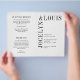 Modern folded wedding program (printed on thin printer paper and comes unfolded) featuring a minimalist black and white design with your names in a large font along the left side and top. This design is simple enough for a formal wedding yet makes a bold statement.