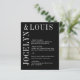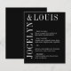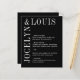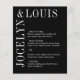 Modern wedding menu featuring a minimalist black design with your names in a large font along the left side and top. This design is simple enough for a formal wedding yet makes a bold statement.