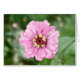A close up photograph of a pink Zinnia, with double pink petal flower with yellow stars.