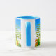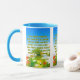 This two-tone mug showcases a design that features a Broadway print font with green letters yellow outline displaying the "John 10:10" KJV bible scripture verse over a picture featuring a collection of flowers with a upclose view under a clear blue sky in the background in this faith based theme. This verse is referencing the Book Of John 10th chapter showing the 10th verse in this bible scripture quote theme from the King James bible. The rim & handle are glazed in matching colours available in 11-ounce or 15-ounce sizes microwave and dishwasher safe ceramic construction.