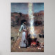 A sorceress draws a fiery magic circle on the earth to create a ritual space as painted by John William Waterhouse.