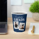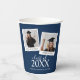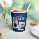 Modern double graduation party paper cups, which features 2 photos of the graduate's. The cup has template text that reads 'CONGRATS GRAD'S, THEIR NAMES, YEAR OF GRADUATION, and THEIR SCHOOL OR COLLEGE NAME'.