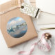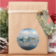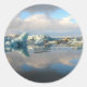Round photo sticker with the reflection of clouds and icebergs in Jokulsarlon, glacier lake in Iceland, where icebergs collapsing from Breidamerkurjokull glacier float around.