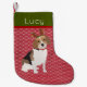 Deck the halls with this adorable personalised dog stocking. A lighthearted design for anyone who loves beagles. A cute cartoon art of a beagle wearing reindeer antlers with a polka dot background. Original vector art by Night Owl's Menagerie, 2016.