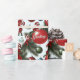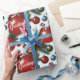 Interspersed throughout the pattern are green pine boughs, adding a touch of natural holiday greenery. Smaller ornaments in various shades of red, green, and blue, as well as some white or silver, are scattered across the paper, further enhancing the festive feel. The overall impression is cheerful and traditional, making it ideal for holiday gift-giving.