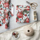 This festive wrapping paper features a repeating pattern of classic Christmas imagery on a white background. The primary motif is a large, glossy red ornament with the word "Greetings" in elegant white script across its centre.