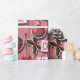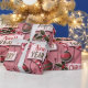 This design features a charming array of holiday elements set against a textured, light pink background that resembles weathered wood.
