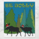Stylised art by Melissa J Barrett featuring bull moose and elk wearing Santa hats in a forest of pine trees.