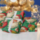 The arrangement of these elements is somewhat staggered and overlapping, creating a dense and lively pattern. The colours are traditional and vibrant, making it ideal for holiday gift-wrapping. The overall aesthetic is cheerful and nostalgic, perfect for capturing the spirit of Christmas.