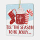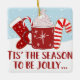 This cute and artsy Christmas holiday ornament is perfect to set the vibe for your seasonal event. It depicts red, white, pastel periwinkle blue, and blush pink hand-drawn hot cocoa, candy cane cookie, and stocking cookie illustrations on top of a bed of snow and falling snow. Also featured on this design is the holiday quote, "Tis' the season to be jolly." It's adorable, modern, unique, and festive for this winter season!