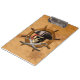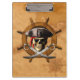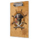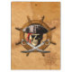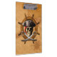 Aargh! Pirate skull, eye patch, pirate hat, and crossed swords over an antique wooden ship's wheel on a vintage nautical map.