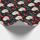 This Christmas gift wrapping paper features a graphic of Santa Claus and is accented with bows and snowflakes on the black background.