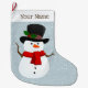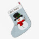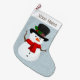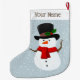 Cute Snowman Design Large Christmas Stocking featuring a jolly snowman with a top hat and scarf, on snowy background. Customisable personalisation on front and back.