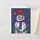 This postcard is dark blue with a jolly snowman wearing a hat and scarf holding a string of glowing colourful Christmas lights in the falling snow.