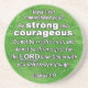 Proudly show your faith with this awesome coaster! White letters display the words of Joshua 1:9 on a green splattered background. A great encouragement verse.