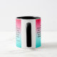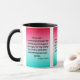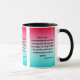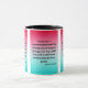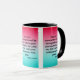 This mug features the "Joshua 1:9" KJV bible scripture in a bold print with black letters plus bible citation with pink & blue background from the King James version. The rim & handle are glazed in matching colours available in 11-ounce or 15-ounce sizes microwave and dishwasher safe ceramic construction.