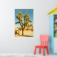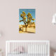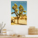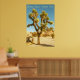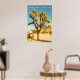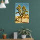 The image features a Joshua tree standing prominently in a desert landscape. The tree has a thick, brown trunk and spiky, green leaves clustered at the ends of its branches. The background consists of a clear, blue sky and sandy ground with scattered rocks and low-lying vegetation. The overall mood is serene and arid, capturing the essence of the desert environment.