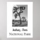 The image showcases a black and white photograph of a desert landscape featuring two prominent Joshua trees. The trees stand tall against a muted sky, their branches reaching out in a variety of directions. The foreground is filled with low-lying desert vegetation, creating a sense of depth and texture.