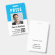 Personalise these vertical press pass badges with an employee photo and name, along with three lines of additional custom text for title or role, media outlet, and valid through date. PRESS appears at the top in bold white lettering. Customise with a QR code on the front. Additional custom text field located on the back for return information or other details.