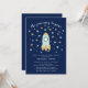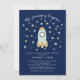 The Journey begins boys baby shower invite featuring a blue & gold rocket & stars.