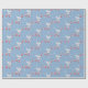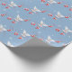 White dove flying with red JOY message on a red and white striped string a blue winter snowflakes background.