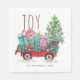 Joy Napkins with watercolor cute Christmas tree and gift box in red wheelbarrow for winter holidays gifts.