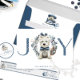 Send this beautiful holiday card and make your friends and family smile! Card with the word "JOY" with letter "O" made by gorgeous hand painted watercolor holiday floral wreath with cute Westie puppy in front of it in a mixture of dusty blue, navy, white and gray tones, while letters "J" and "Y" with attractive decorative swirl paisley paper in blue and silver gray. Inside decorative paper stripe on the bottom, and puppy with Santa hat and blue and silver Christmas ornaments showcasing your message, which you can print here or erase from text boxes to receive inside card clear of text and hand write your message at home. Lettering, ornaments, Christmas gift box and decorative paper stripe in blue, silver and white hues. Collection with coordinating products available.