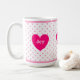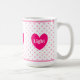 Beautiful mug with heart, pink polka dots and personalised joy, love, light text.
