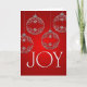 Joy ornaments in silver on jewel tone colours of red, green and blue. an elegant design for the holidays that has a retro feel.