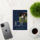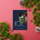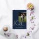 Elegant gold foil, "Joy, Peace, Happiness", holiday wreath photo greeting in blue and gold. The word Joy has a wreath for the letter O and this pretty leaf continues to the back of the card as a frame for an additional photo.