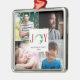 Personalised metal ornament featuring a festive “JOY” design and space for four family photos. Customisable with your family name and year. A beautiful keepsake for your holiday tree. Joy Christmas theme Modern 4 photo collage personalised ornament