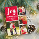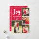 Vertical holiday photo card design features a festive red background (can be customised) and stylish "Joy" brushed script lettering. Personalise the custom text with your family name and year, and add your four (4) favourite photos to the photo collage template. A pattern of white snowy dots appears on the back of the card. Photography © Storytree Studios, Stanford, CA