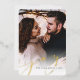 Our simple and elegant holiday photo card features your favourite full bleed vertical or portrait orientated photo, fading to white at the bottom. "Joy" appears as a gold foil script text overlay along with your names or family name, and the year. Cards reverse to a winter leaves pattern.