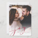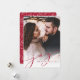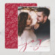 Our simple and elegant holiday photo card features your favourite full bleed vertical or portrait orientated photo, fading to white at the bottom. "Joy" appears as a classic cranberry red script text overlay along with your names or family name, and the year. Cards reverse to a winter leaves pattern.