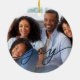 Simple and elegant holiday ornament features a photo on each side with "joy" overlaid in navy blue script lettering. Personalised with the year beneath on one side, and your family name on the other.