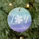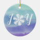 This beautiful ornament features the word joy with a snowflake in place of the letter "o". It has a colourful watercolor background with shades of blue and purple. A wonderful way to express the joy of the season in your home.