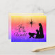 Lovely "Joy to the World" Christmas greeting card features a beautiful silhouette nativity with sparkling stars and a rainbow of colours. The inspiring back prayer can be modified to make a personal greeting.-