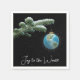"Joy to the World" text with globe ornament hangs from a snowy pine tree branch, illuminated against a black night sky filled with shimmering stars.