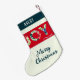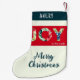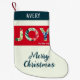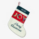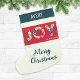 A stylish stocking with 'Joy to the world' words in the centre, with the word 'Joy' infilled with a botanical green leaf and red poinsettia flower design. Below this is the greeting 'Merry Christmas' in festive script typography. The stocking can be personalised with a name on the green panel at the top.