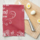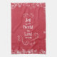 Joy to the World the Lord is Come Christmas kitchen towels with red background and white font. With vintage inspired bokeh white edging.