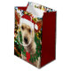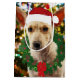 A digital art painting of a young pup ready for Christmas with a wreath, Santa hat and a decorated tree.