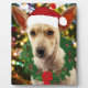 A digital art painting of a young pup ready for Christmas with a wreath, Santa hat and a decorated tree.