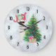 A clock with a funny illustration. A cute llama wearing black sunglasses and a red santa hat. Standing behind a Christmas tree with festive presents. The word Joy written above his head in a colorful holiday font. Silver bokeh background. Whimsical and fun Christmas themed design.