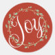A simple botanical wreath with berries and the word "Joy" in script on a red background. The perfect envelope seal for your holiday cards!