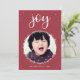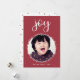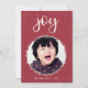 Photo Christmas card in a gorgeous deep red where you can add one of your photos inside a white wreath frame. Joy is written above the photo in charming brush script. Add your family name too, and the year. The back features a fun confetti pattern in red and white.