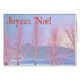 A digital painting of snow-covered birch trees; tinged pink by the setting sun. French text reading, "Joyeux Noёl" appears in red. Here in the north it is common to see snow-covered trees tinged either pink or orange by the sun hanging low on the horizon.