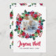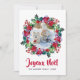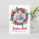This chic holidays design features your favourite photo surrounded by a watercolor floral wreath of holly, Christmas stockings, poinsettias and candy canes in festive red and green. Below in modern red text "Joyeux Noël" with your family name and year below in plum typography. On the reverse is a coordinating pattern of watercolor Christmas stockings and floral elements. Simply add your own photo and edit the text in the text boxes provided.